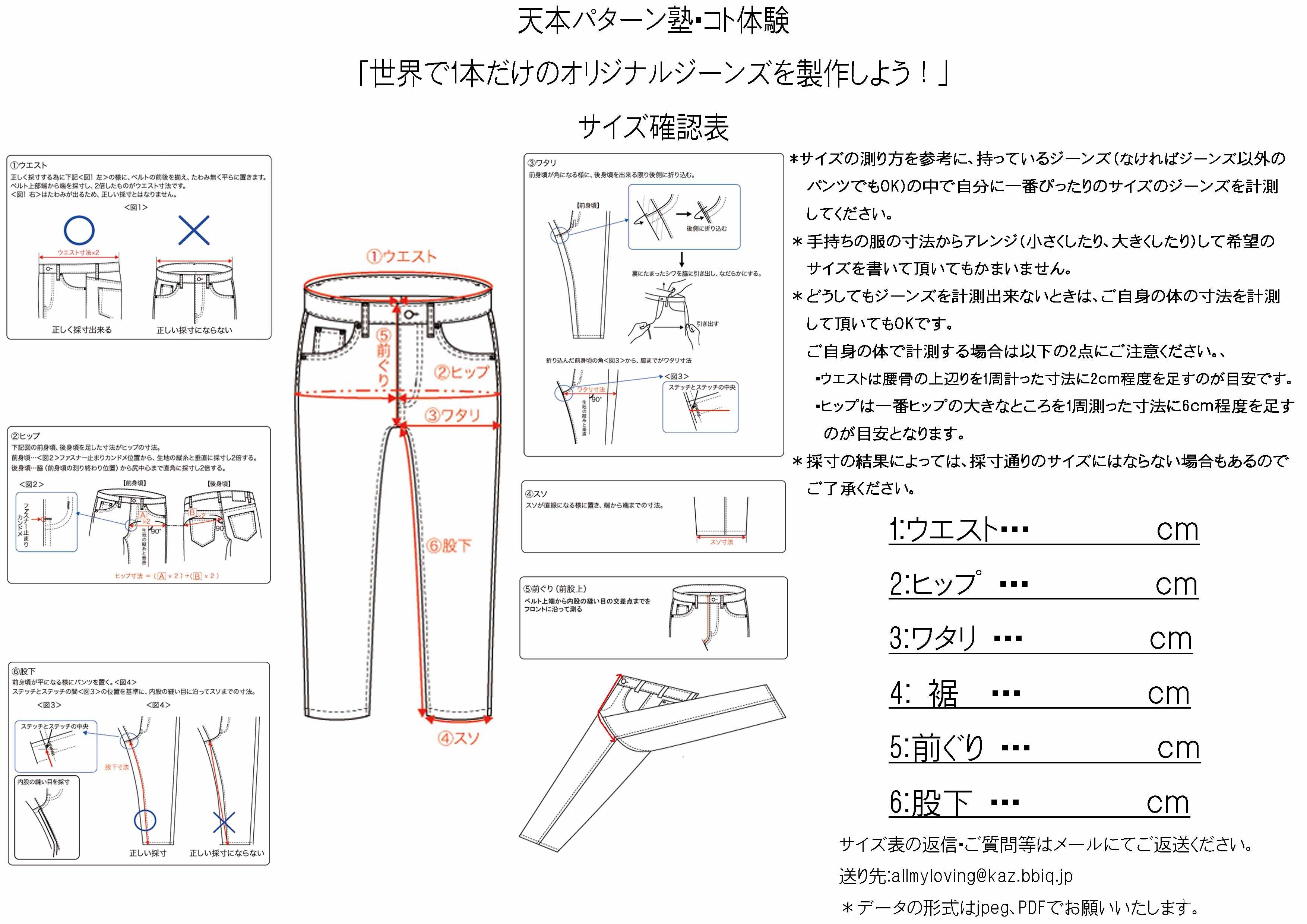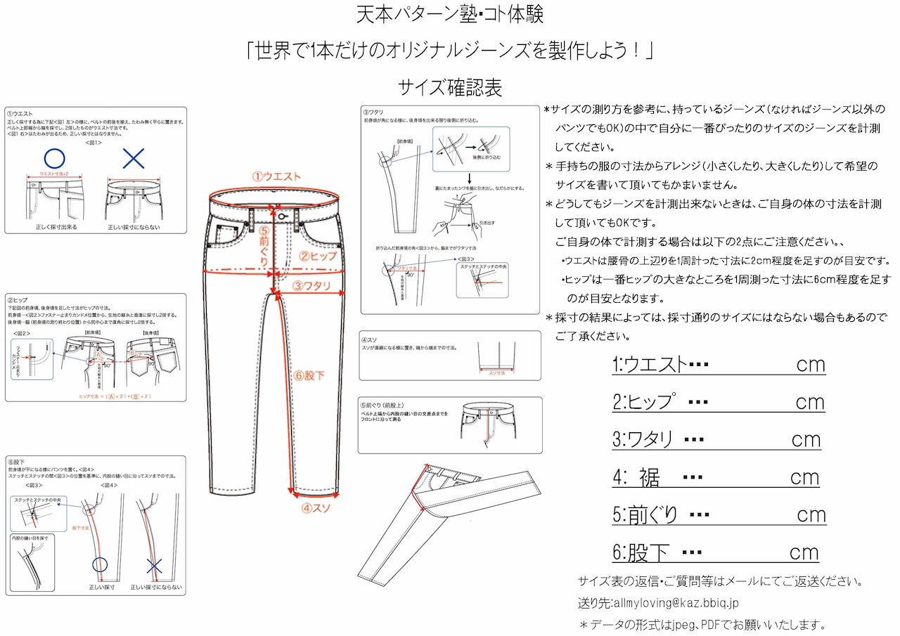 2、サイズシートに作りたいジーンズのサイズをご記入し、返信ください。